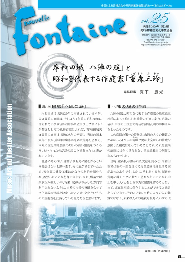 2009年10月25日 / 最終更新日時 : 2026年2月16日 kanri28 情報誌「ぬーべるふぉんてーぬ」 ぬーべるふぉんてーぬ vol.25 【岸和田城「八陣の庭」と昭和を代表する作庭家「重森三玲」】 ぬーべるふぉんてーぬ vol.25.pdf(2MB) FacebookX